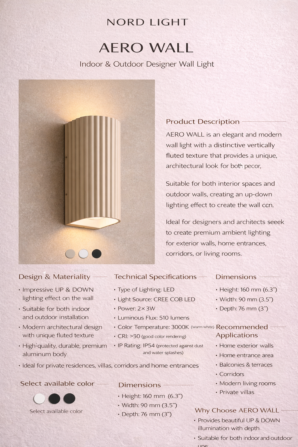 זהו גוף תאורה שמתאים במיוחד למעצבים ואדריכלים שרוצים ליצור תאורת אווירה יוקרתית לקירות חוץ, כניסות לבית, מסדרונות או סלונים.