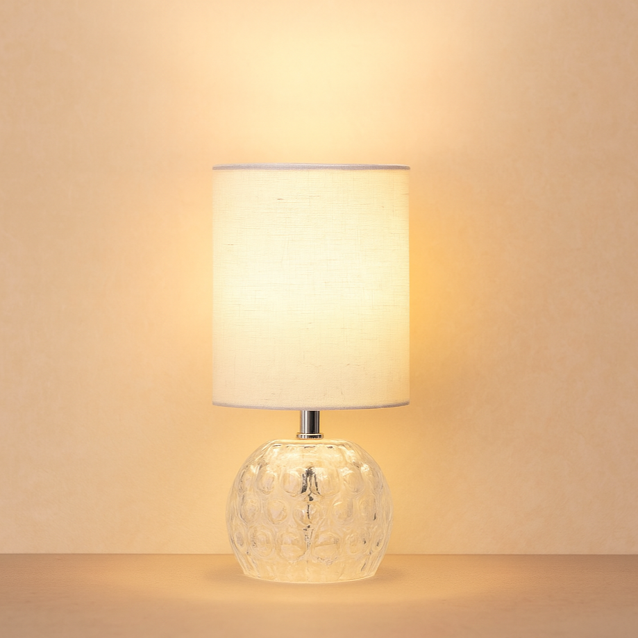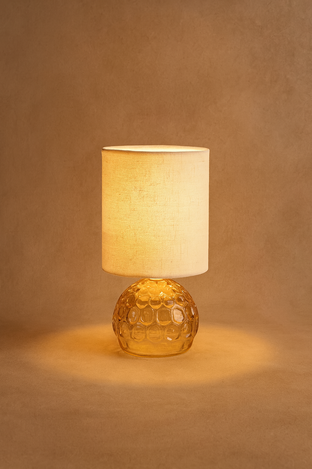 המנורה משלבת אהיל בד איכותי עם בסיס זכוכית מעוצבת, ליצירת מראה יוקרתי ומודרני המתאים לסלון, חדר שינה, משרד או פינת קריאה.