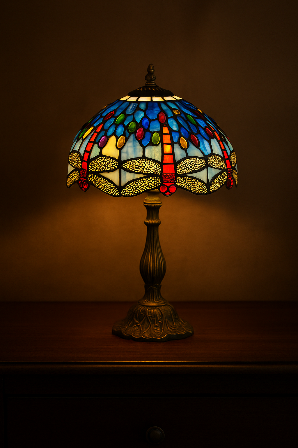 מנורת שולחן טיפאני בקוטר 30 ס”מ היא יצירת אומנות של ממש, המשלבת עבודת זכוכית צבעונית בעיצוב עשיר ויוקרתי. כל חלק בזכוכית נחתך, שולב והולחם בעבודת יד מדויקת – בדיוק כפי שנעשו המנורות המקוריות בסוף המאה ה־19.