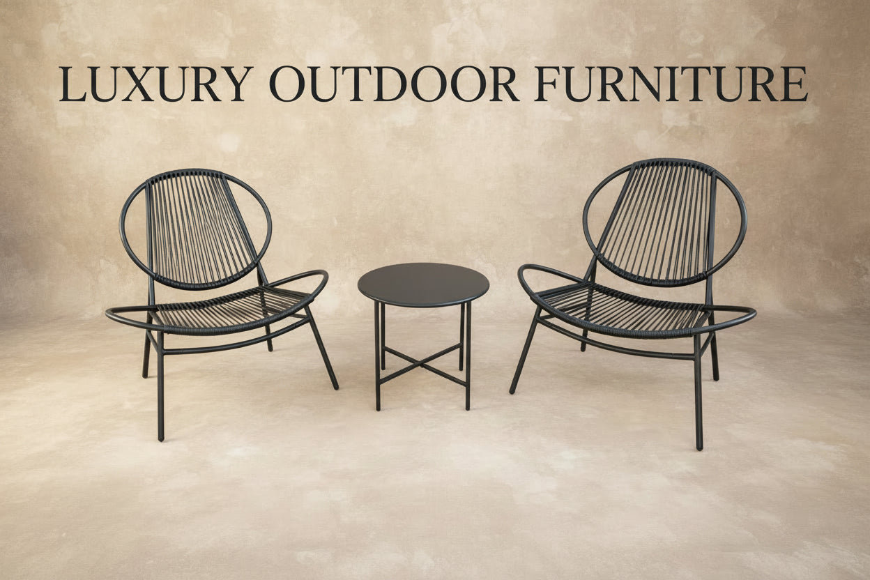 מערכת ישיבה לגינה יוקרתית ממתכת – זוג כיסאות ושולחן עגול בעיצוב מודרני