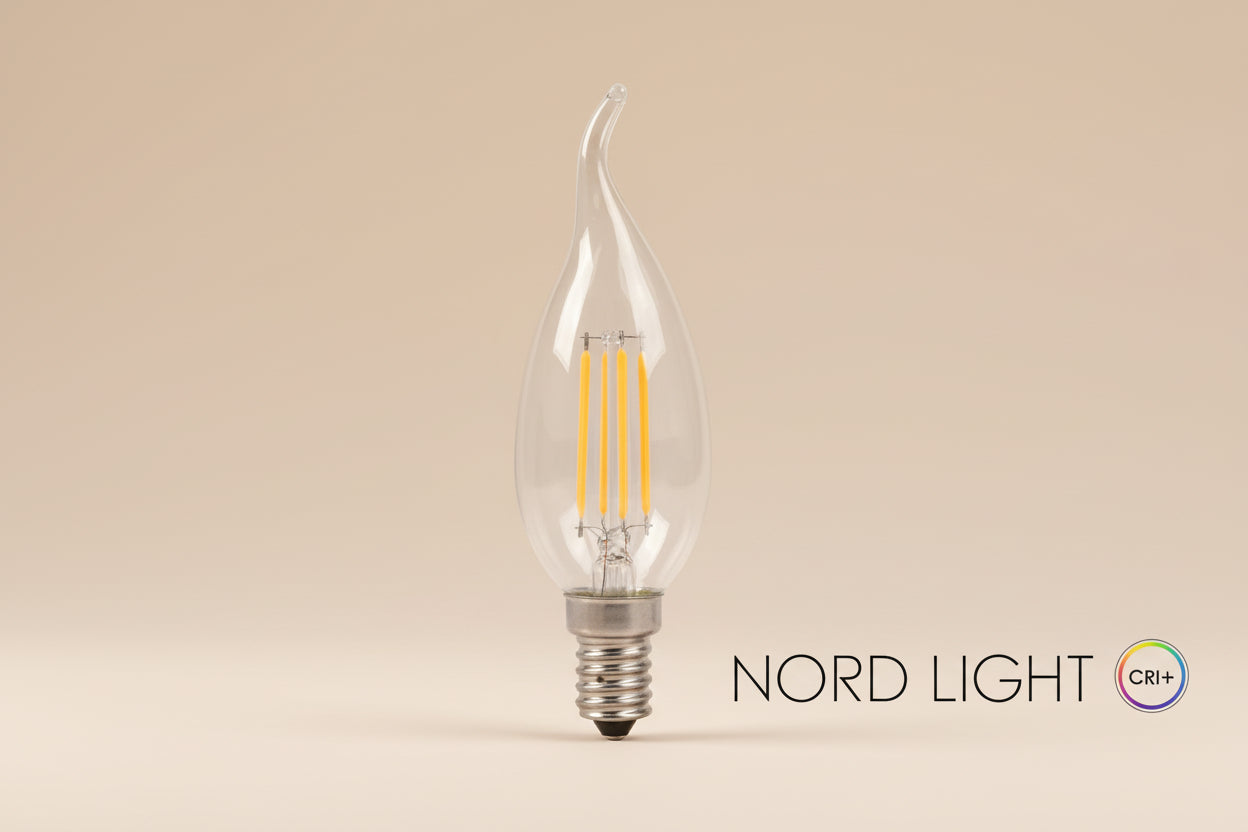 נורת LED בסיס E14 בצורת נר להבה, בעיצוב דקורטיבי מרשים המתאים במיוחד לנברשות, מנורות קיר וגופי תאורה פתוחים בהם הנורה גלויה ומהווה חלק מהעיצוב.