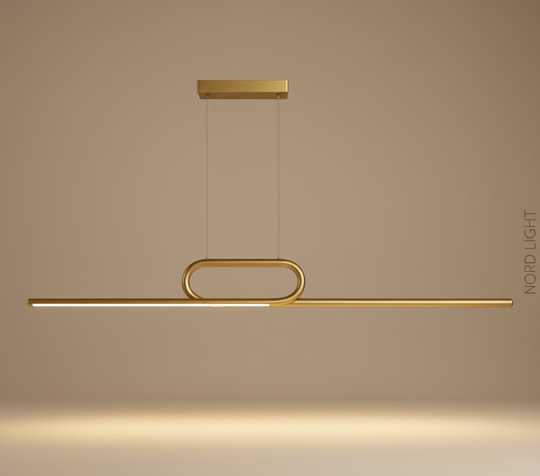 העיצוב המוארך באורך 150 ס”מ, בשילוב טבעת מרכזית מעוגלת בגוון זהב מוברש, יוצר מראה מושלם למטבח, לפינת אוכל, לחלל סלון או לאי מרכזי.