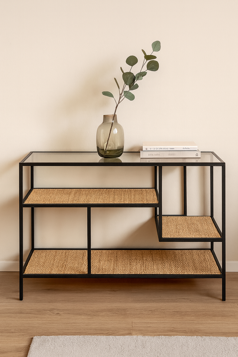 המשטח העליון מזכוכית שקופה מוסיף מראה אוורירי ומודרני, בעוד שהמדפים התחתונים מציעים מקום אחסון ושילוב של טקסטורה וחומר. הקונסולה משתלבת נהדר בכניסה לבית, בסלון או במשרד, ומתאימה לכל מי שמעריך עיצוב מינימליסטי עם נוכחות.