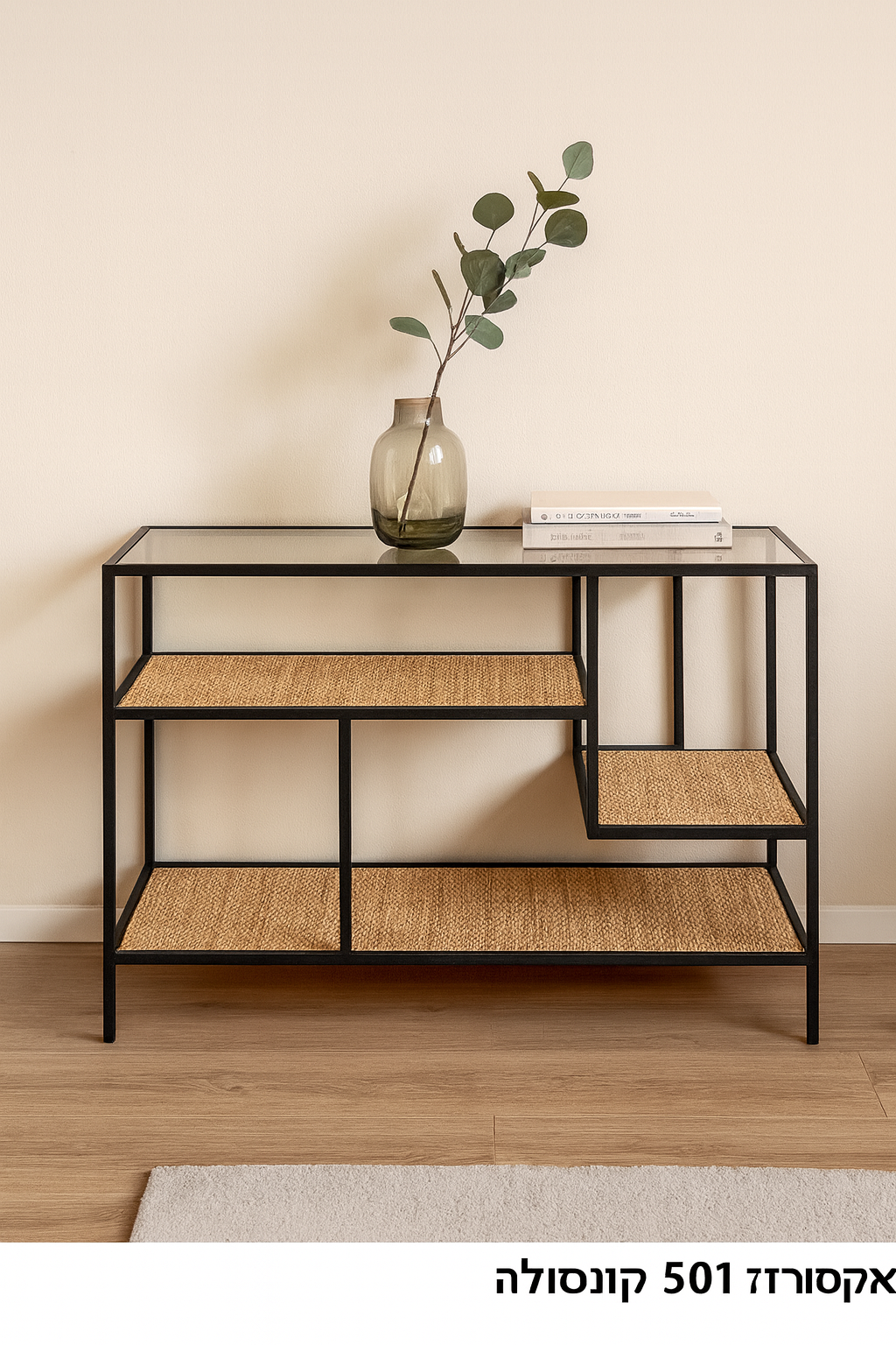 קונסולת 501 מעוצבת בקווים נקיים ומודרניים, עם שילוב מרשים של מסגרת מתכת שחורה דקה ומדפי ראטן טבעי בגוון חמים. העיצוב מעניק איזון מושלם בין תחושת קלילות עכשווית לטאץ’ טבעי שממלא את החלל באווירה נעימה ויוקרתית.