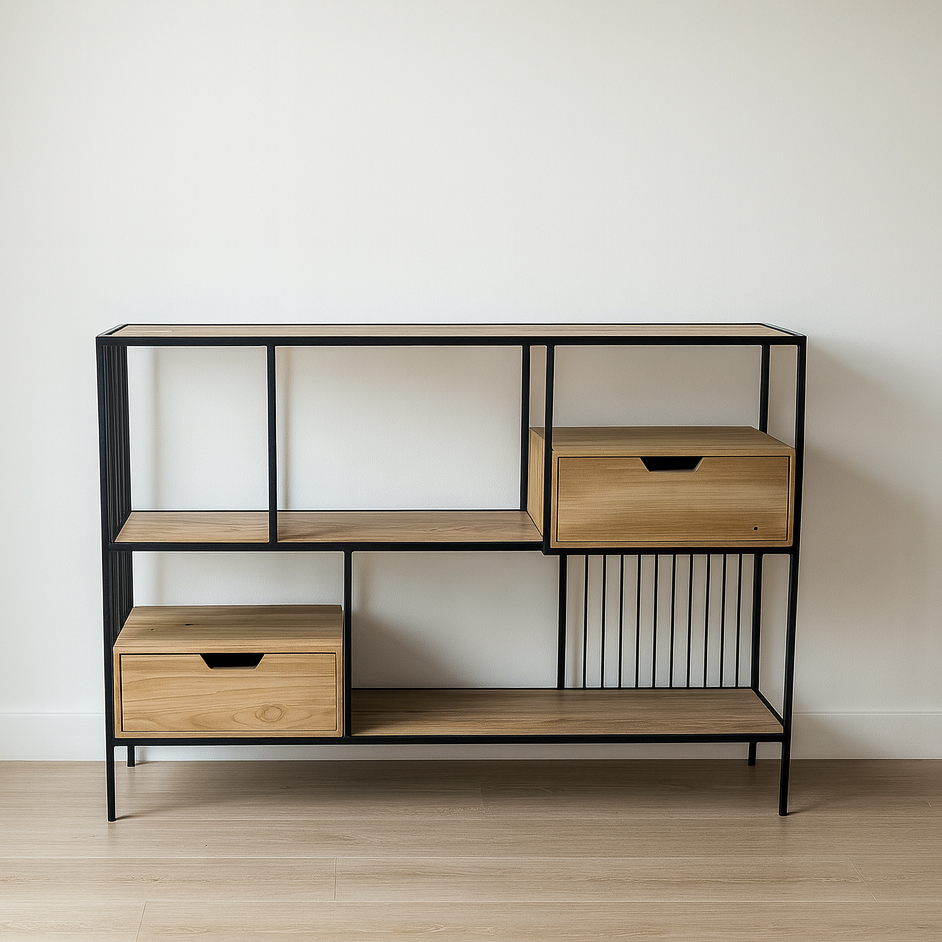 קונסולת 197 היא שילוב מושלם בין מתכת שחורה דקה לעץ טבעי בגוון חמים, המעניקים יחד מראה אלגנטי ותחושת יוקרה טבעית. העיצוב המדורג עם שני מגירות אחסון ומדפים פתוחים יוצר איזון מושלם בין פרקטיות לעיצוב.