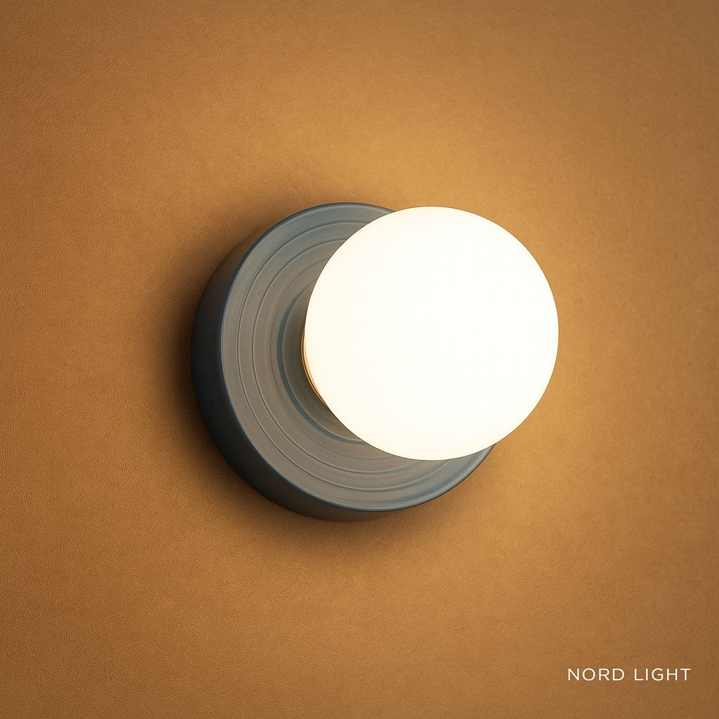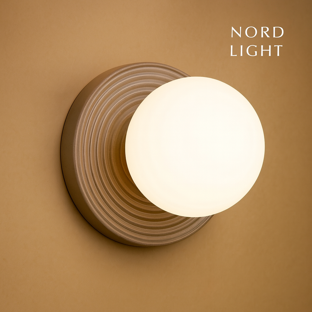 תאורת קיר עגולה בעיצוב מודרני וייחודי, עשויה מקרמיקה איכותית בשילוב כדור זכוכית חלבי המפיץ אור רך ונעים.