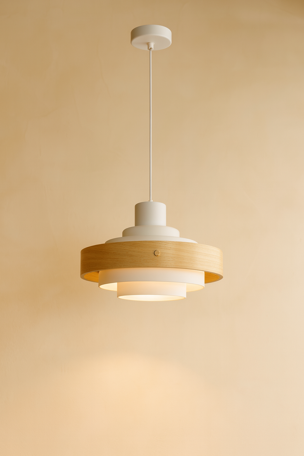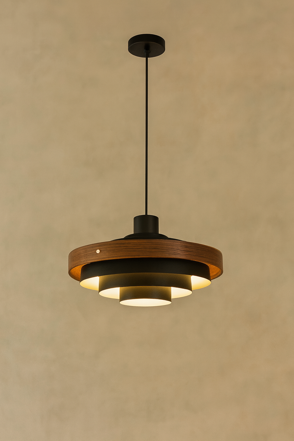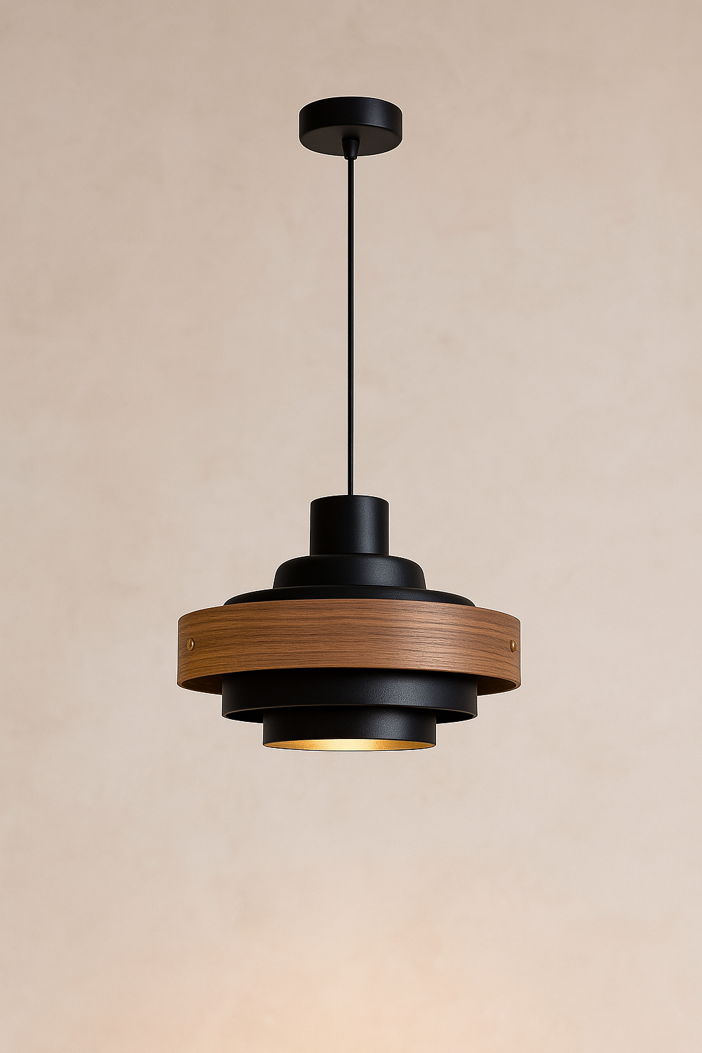 גוף תאורה דקורטיבי תלוי בעיצוב מודרני, המשלב מתכת ועץ ליצירת מראה ייחודי וחמים. מתאים להארת פינות אוכל, מסעדות, חדרי מגורים וחדרי שינה – ניתן לשימוש כיחידה בודדת או בהרכבים מרשימים ליצירת אווירה מושלמת.