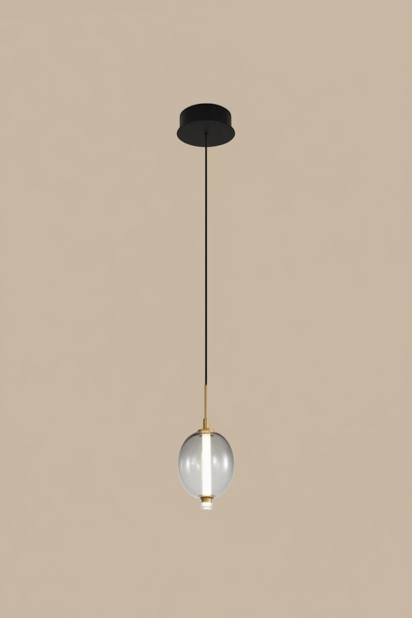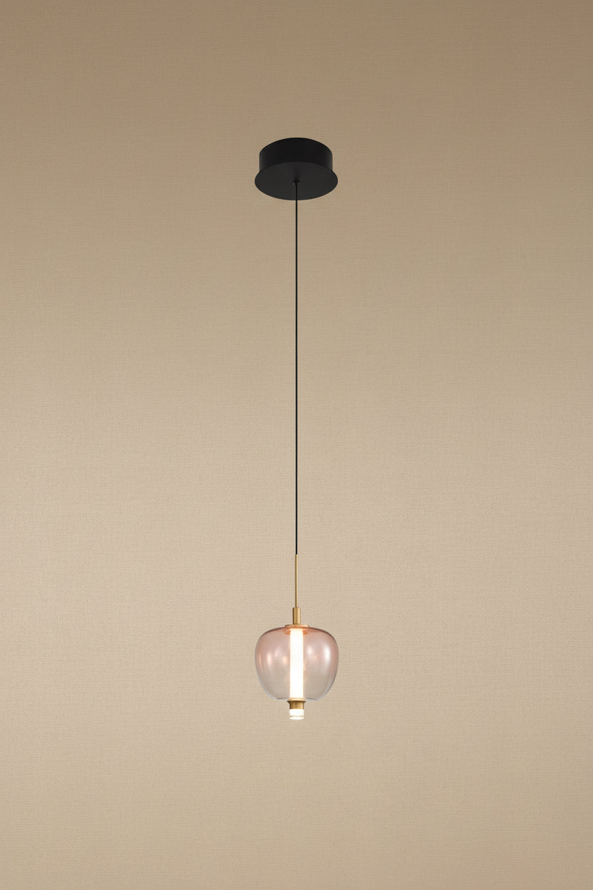 מנורת תלייה אלגנטית עם אהיל זכוכית מעוצב ואלמנט פליז יוקרתי, זמינה בשלוש צורות שונות עם גווני זכוכית ייחודיים. מושלמת לאי מטבח, פינת אוכל, שידות וחללים מעוצבים