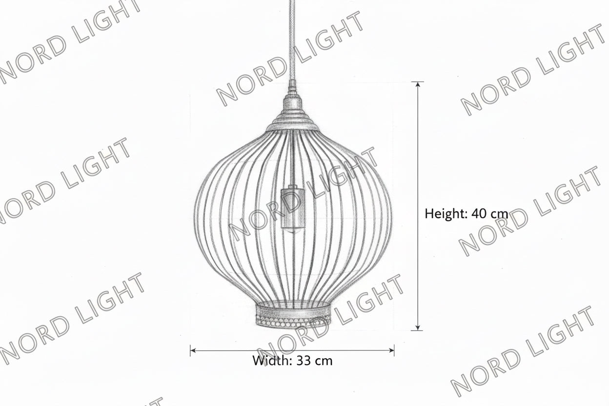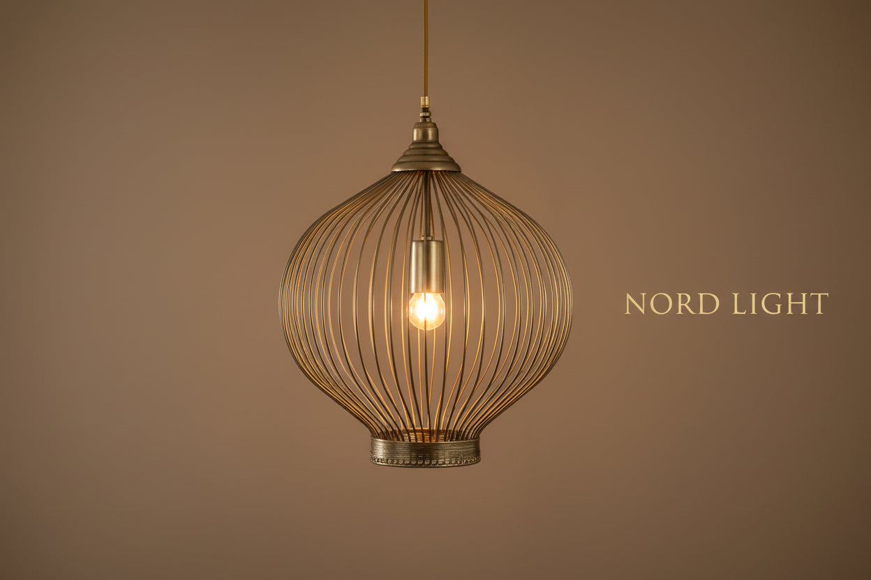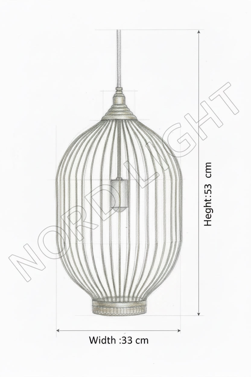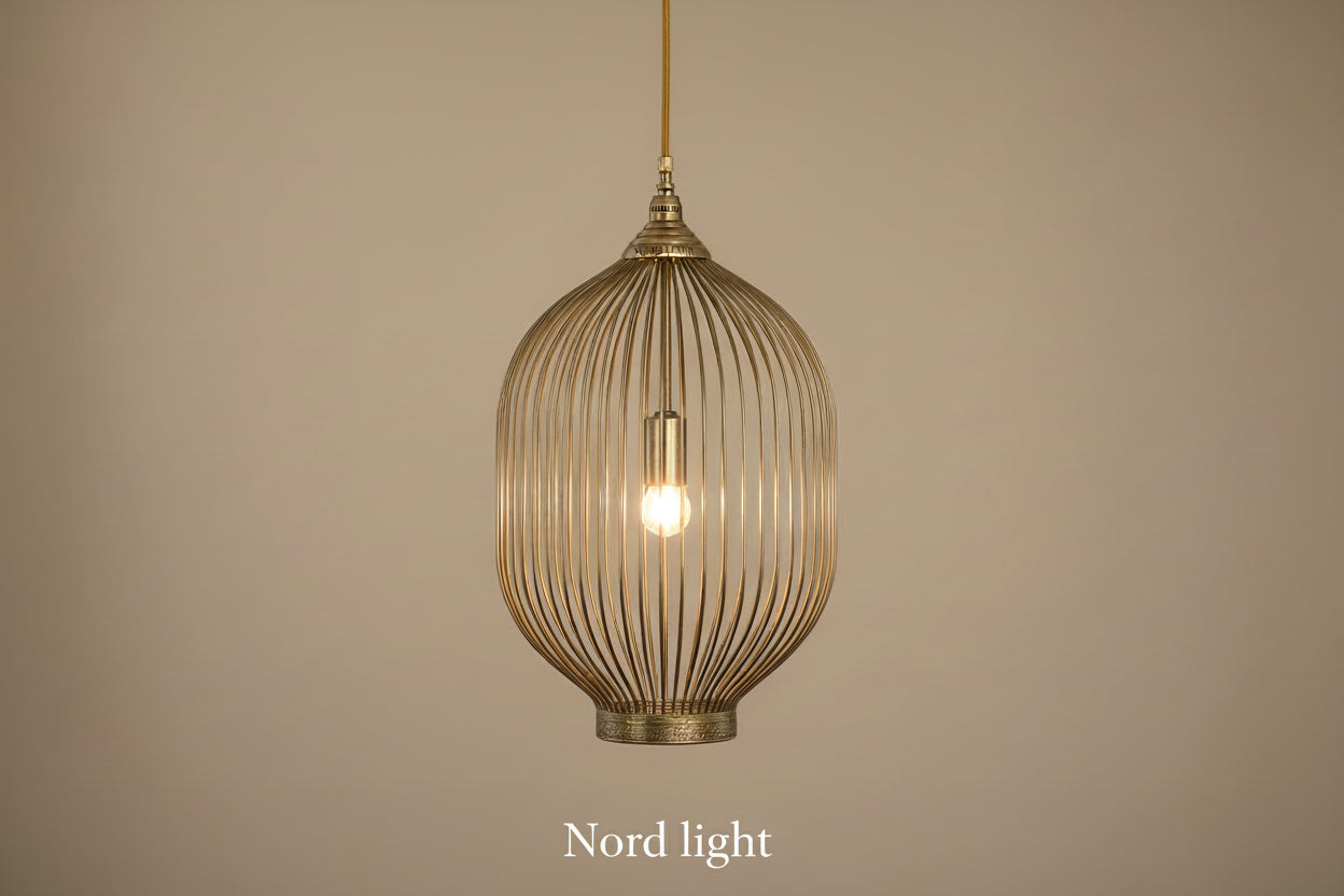 AURA CAGE היא מנורת תלייה מרשימה בעיצוב כלוב פתוח, עשויה מתכת איכותית בגוון פליז חם ואלגנטי. העיצוב האוורירי יוצר נוכחות עיצובית חזקה אך לא כבדה, ומשלב בין מראה קלאסי־אלגנטי לבין טאץ’ מודרני שמושך את העין מכל זווית.
